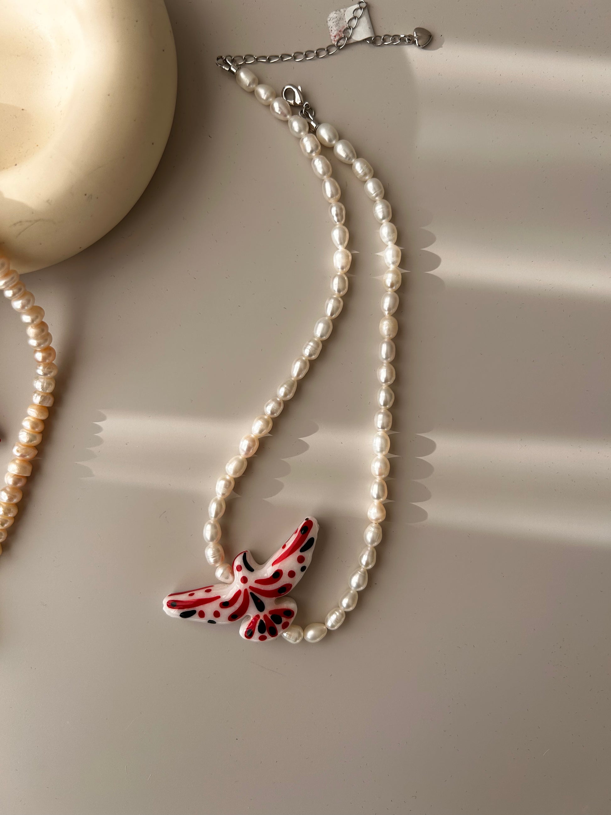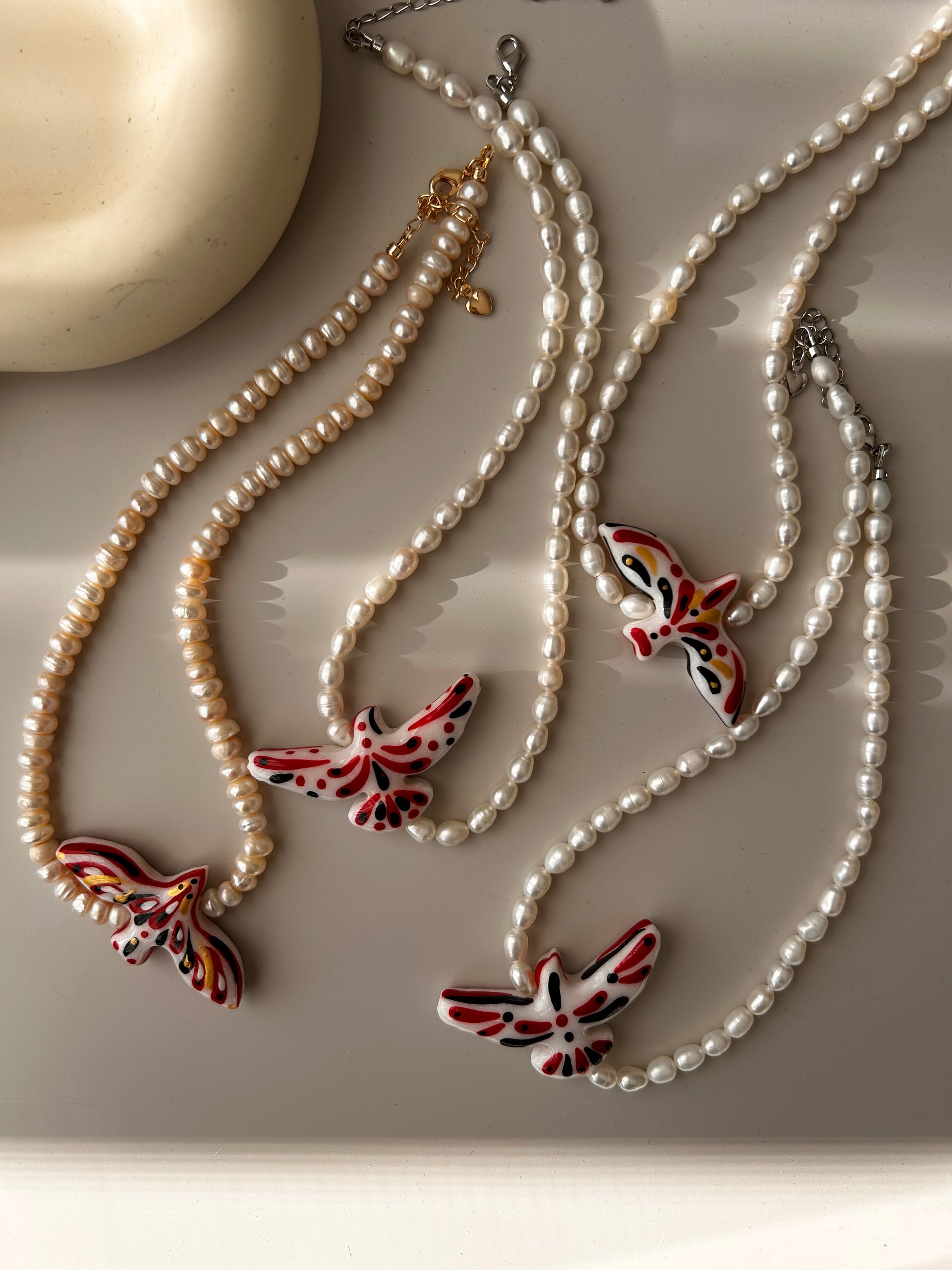 A delicate necklace featuring a natural freshwater pearl paired with a handcrafted polymer clay bird—a powerful Ukrainian symbol of freedom and resilience.