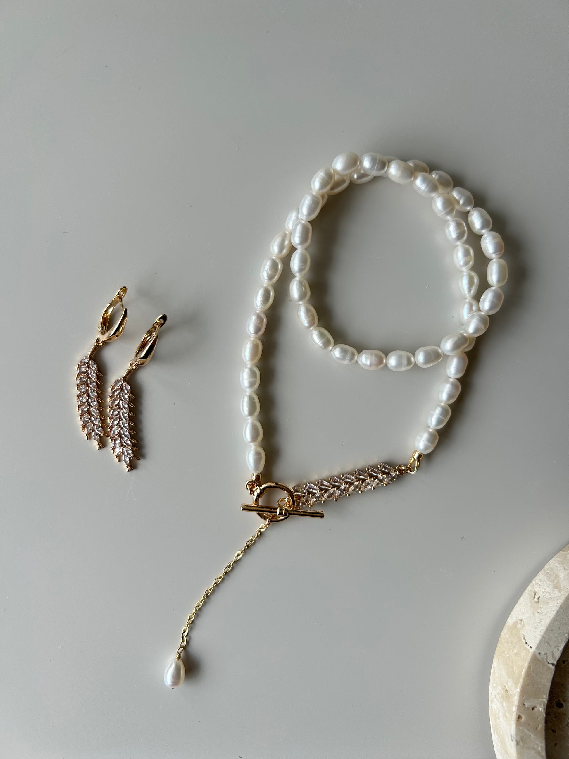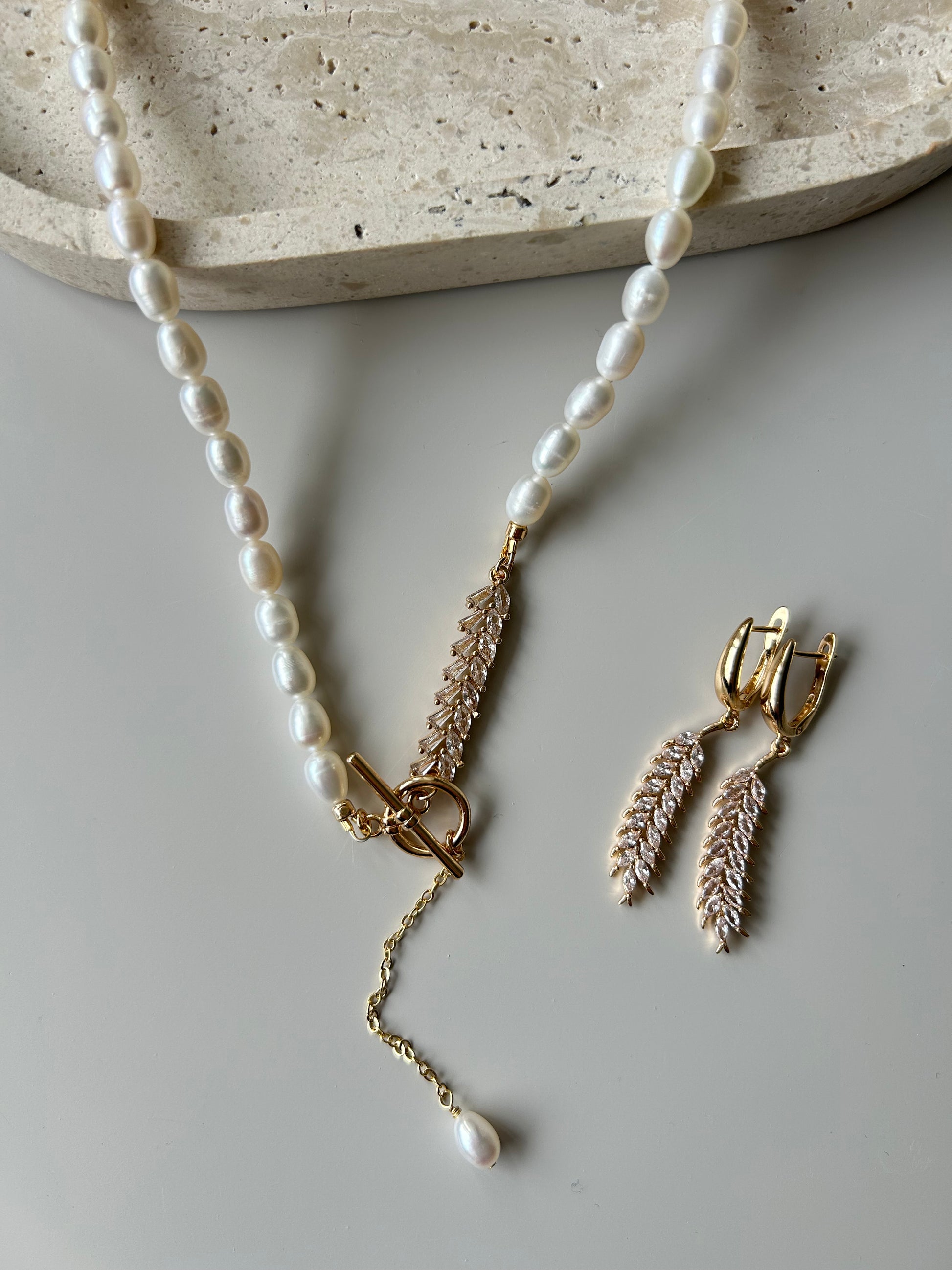 A delicate jewelry set inspired by the Ukrainian symbol of strength and prosperity — the wheat ear. The necklace (length 46 cm) is made of freshwater pearls and gold-plated stainless steel accents, complemented by elegant wheat-shaped earrings. Together, they create a harmonious look of elegance and femininity.