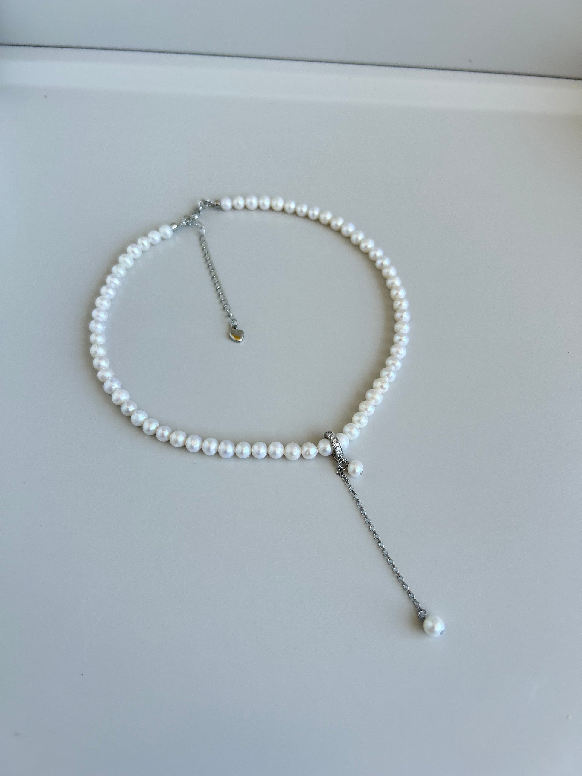 Elegant and versatile, this bracelet is designed to celebrate timeless beauty with a modern twist. Crafted from natural pearls and accented with platinum-plated details, it offers both sophistication and durability. Measuring 36 cm, it features a removable chain, allowing you to adjust the style and wear it in a way that suits you best. A delicate piece that transitions seamlessly from everyday elegance to special occasions.